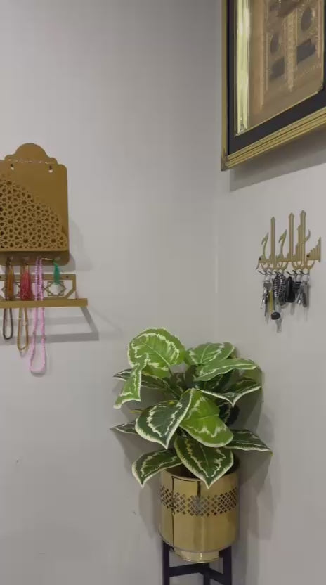Premium metal wall-mounted holder designed specifically for storing your prayer mat (jaynamaz). Features elegant Islamic geometric patterns that add a touch of sophistication to your prayer space.